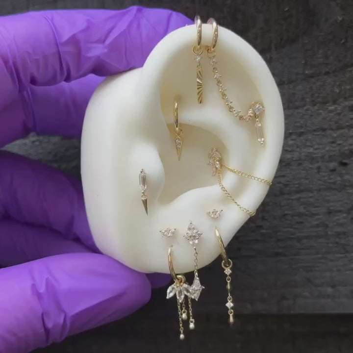 Ischia evokes quiet luxury — a minimalist gold drop charm punctuated by two luminous Swarovski CZs. Its elongated silhouette brings movement, light, and elegance to any piercing, making it a refined accent for your curated stack.
